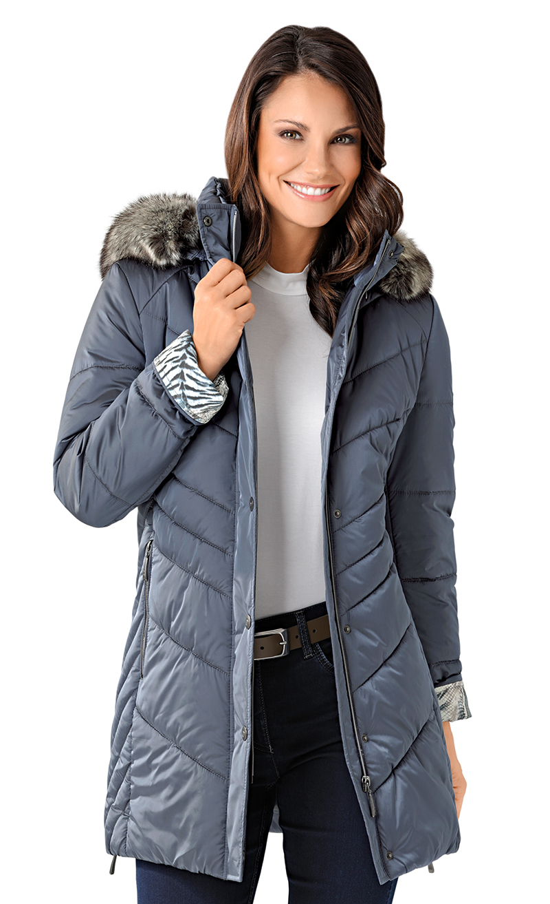 Knopf- und Reissverschluss. Abnehmbare Kapuze mit Kunstpelz. Zwei Taschen mit RV. Eine Innentasche. Taftfutter.