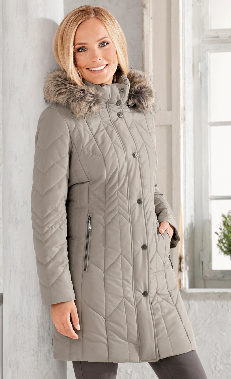Knopf- und Reissverschluss. Längssteppung. Kapuze mit Kunstpelz abtrennbar. Zwei Aussen- und eine Innentasche. Taftfutter.