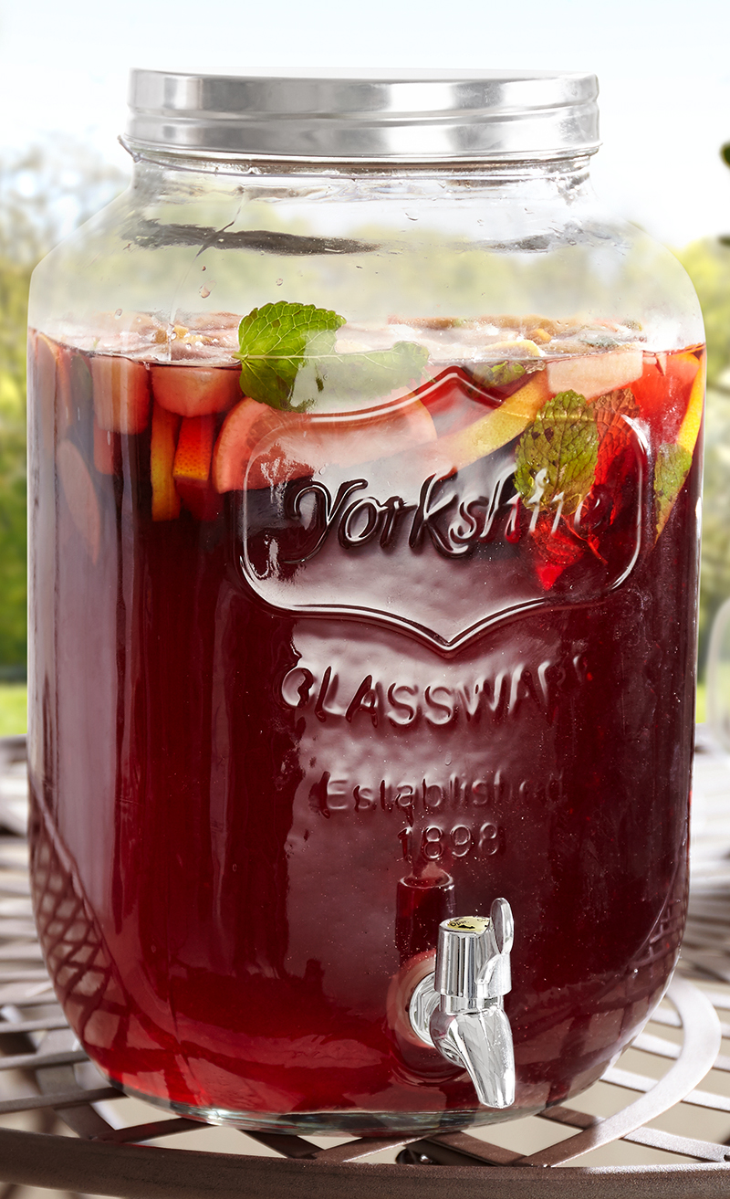 Getränkespender aus Glas und Drehverschlussdeckel. Mit Zapfhahn. Fassungsvermögen ca. 7,7 Liter. Masse ca. 20 x 25 x 31 cm.