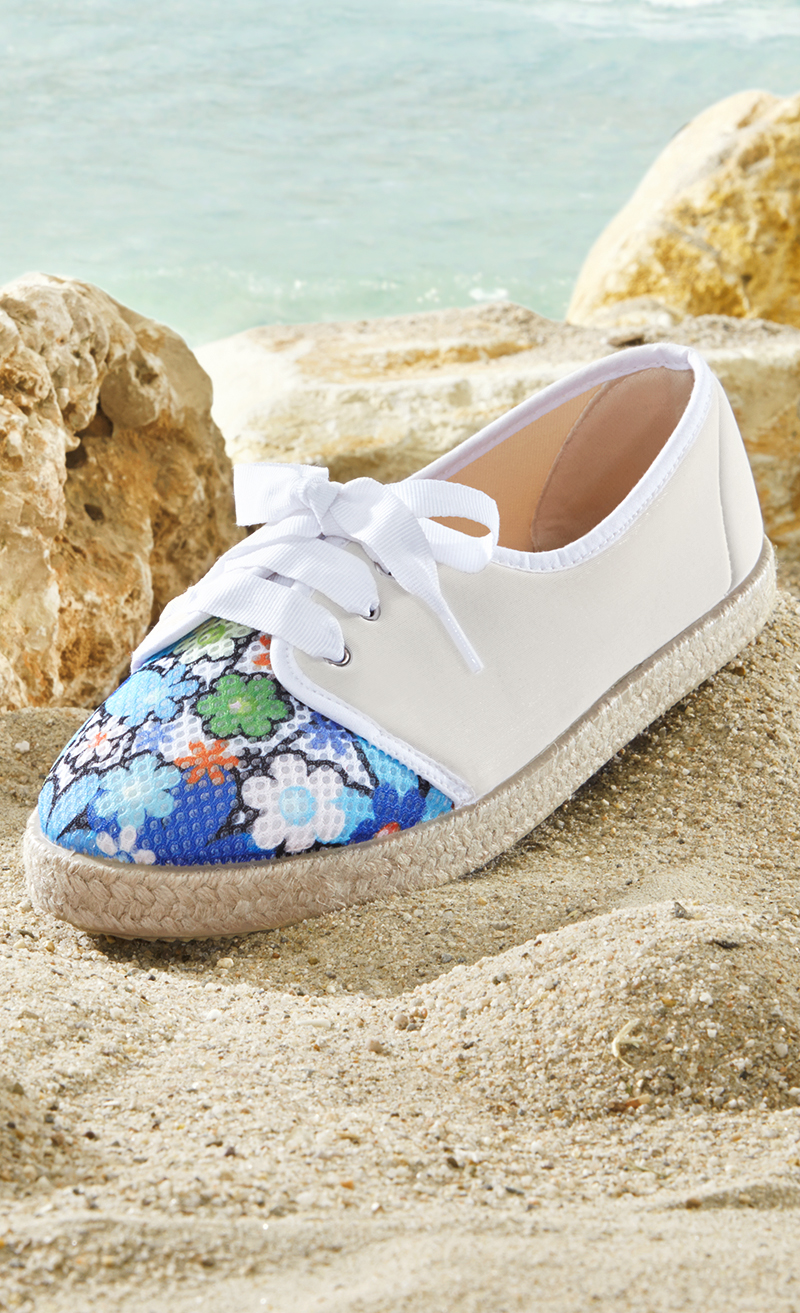 Modisch und bequem. Leichter Sommer-Schuh. Elastisches Neopren-Obermaterial, ideal bei Hallux-Valgus Problemen. Das elastische Material passt sich optimal Ihrem Fuss an. Die Espadrilles-Sohle gibt dem Schuh einen sommerlichen Look.
