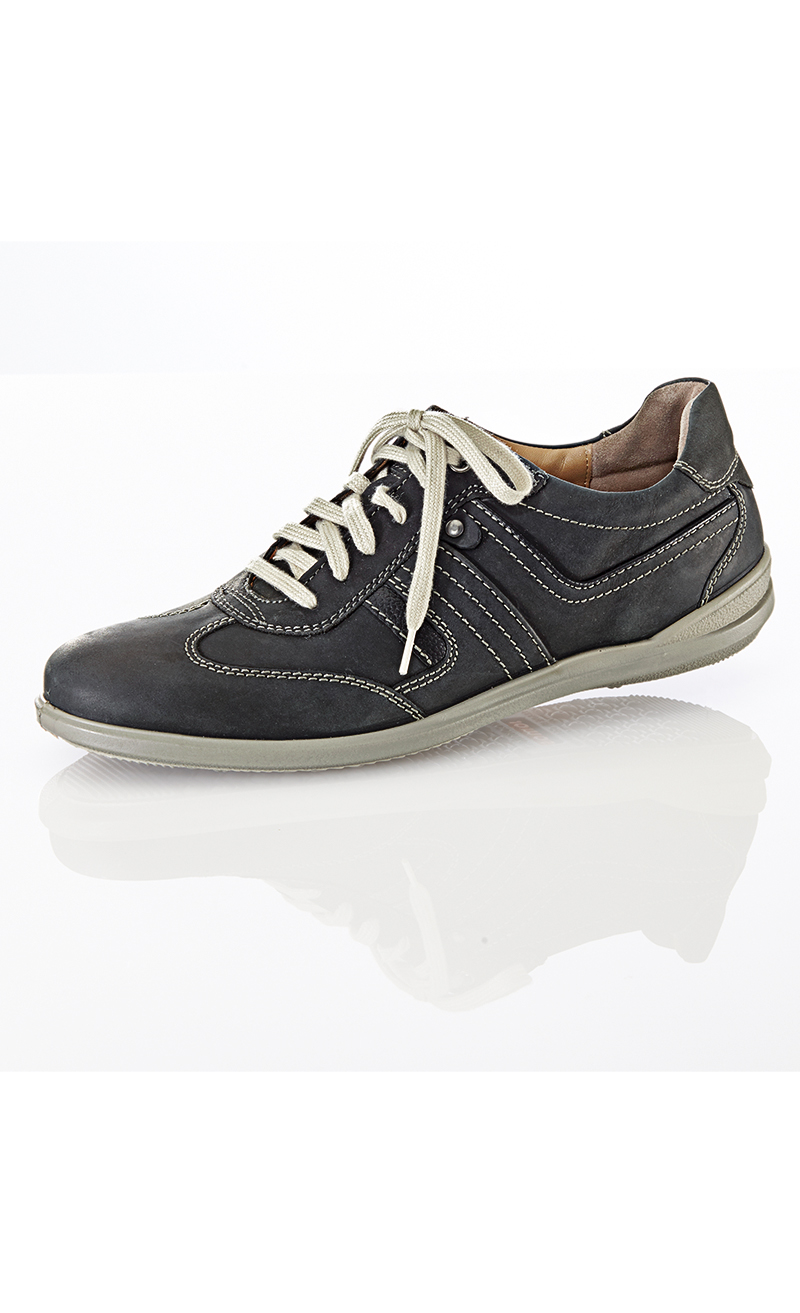 Weiches Leder. Farbmix und mit Kontrast-Steppnähten. Zunge und Schaftrand weich gepolstert. Atmungsaktives Aircomfort-Wechselfussbett. Rutschhemmende Laufsohle. Bequeme Weite H.