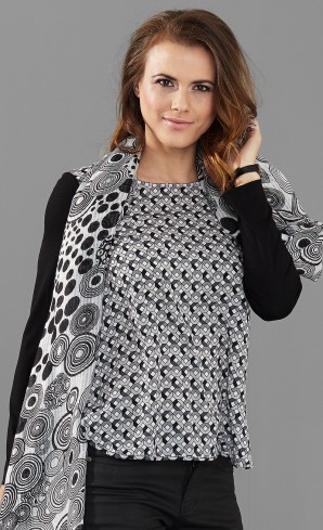 Bluse mit Jersey-Ärmeln. Hinten länger geschnitten. Abgerundeter Saum mit Seitenschlitzen.