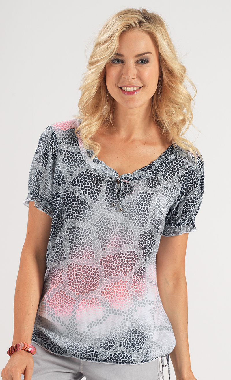 Bedruckt, leicht ausgestellte Form. Ausschnitt mit Bindeband. Saum mit Kordelzug verstellbar.