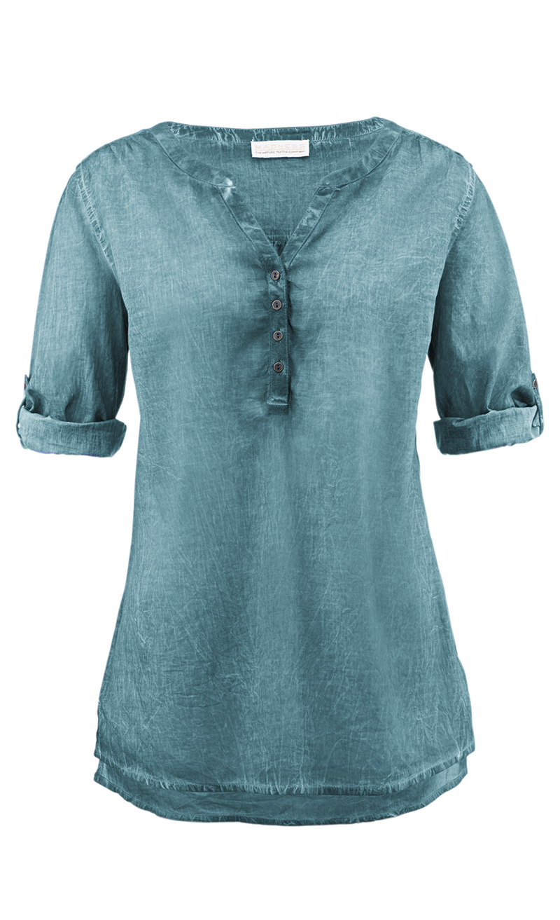 Leichte Qualität. Used Look. Krempelärmel mit Knopfriegel zum Fixieren. Saum hinten etwas länger geschnitten und mit 5 cm Schlitz.