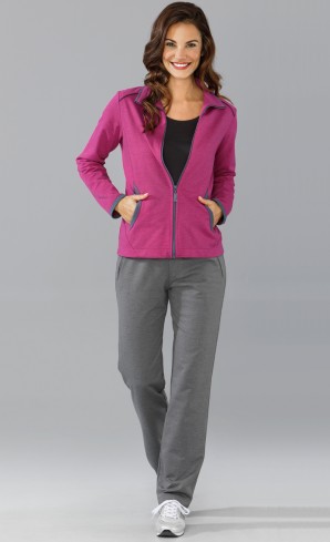 Jacke mit Reissverschluss und zwei seitlichen Eingrifftaschen. Kontrasteinsätze. Figurgünstige Form. Hose mit elastischem Bund, innen Kordel. Zwei RV-Taschen. Jersey-Qualität.