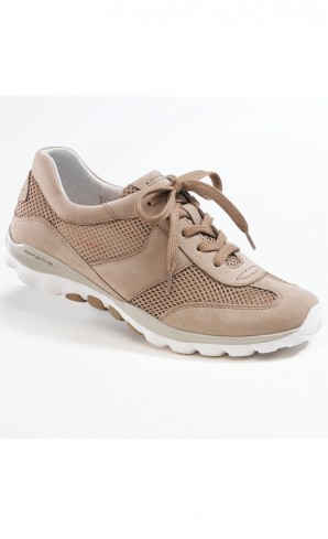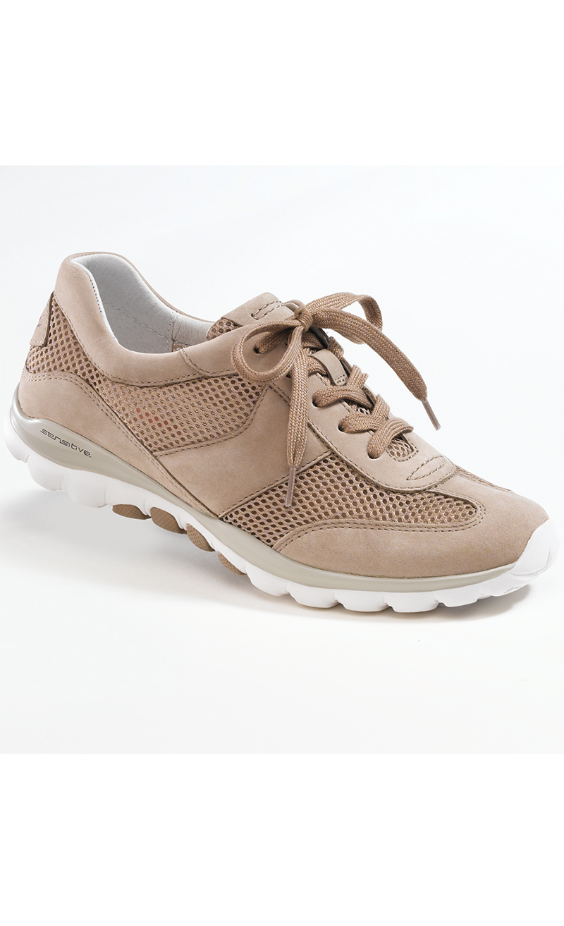 Hochaktuelle Qualität aus Nubuk-Leder mit Mesch-Einsätzen. Auswechselbares Fussbett. Gummilaufsohle mit "Rolling-Soft-Sensitive System". Absatz ca. 2 cm.