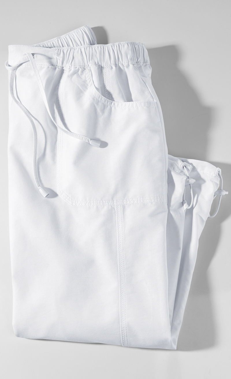Elastischer Bund mit Kordelzug. Zwei Taschen. Verstellbare Beinweite.