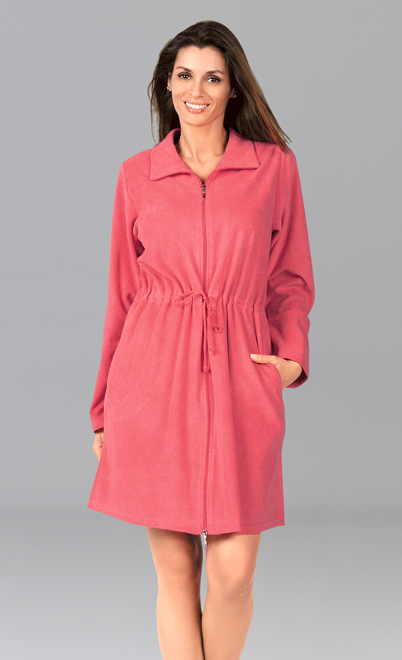 Leichter Frottée Kurzmantel. Stehkragen. Reissverschluss. Tunnelzug am Bund mit Kordel. Seitenschlitz ca. 15 cm.