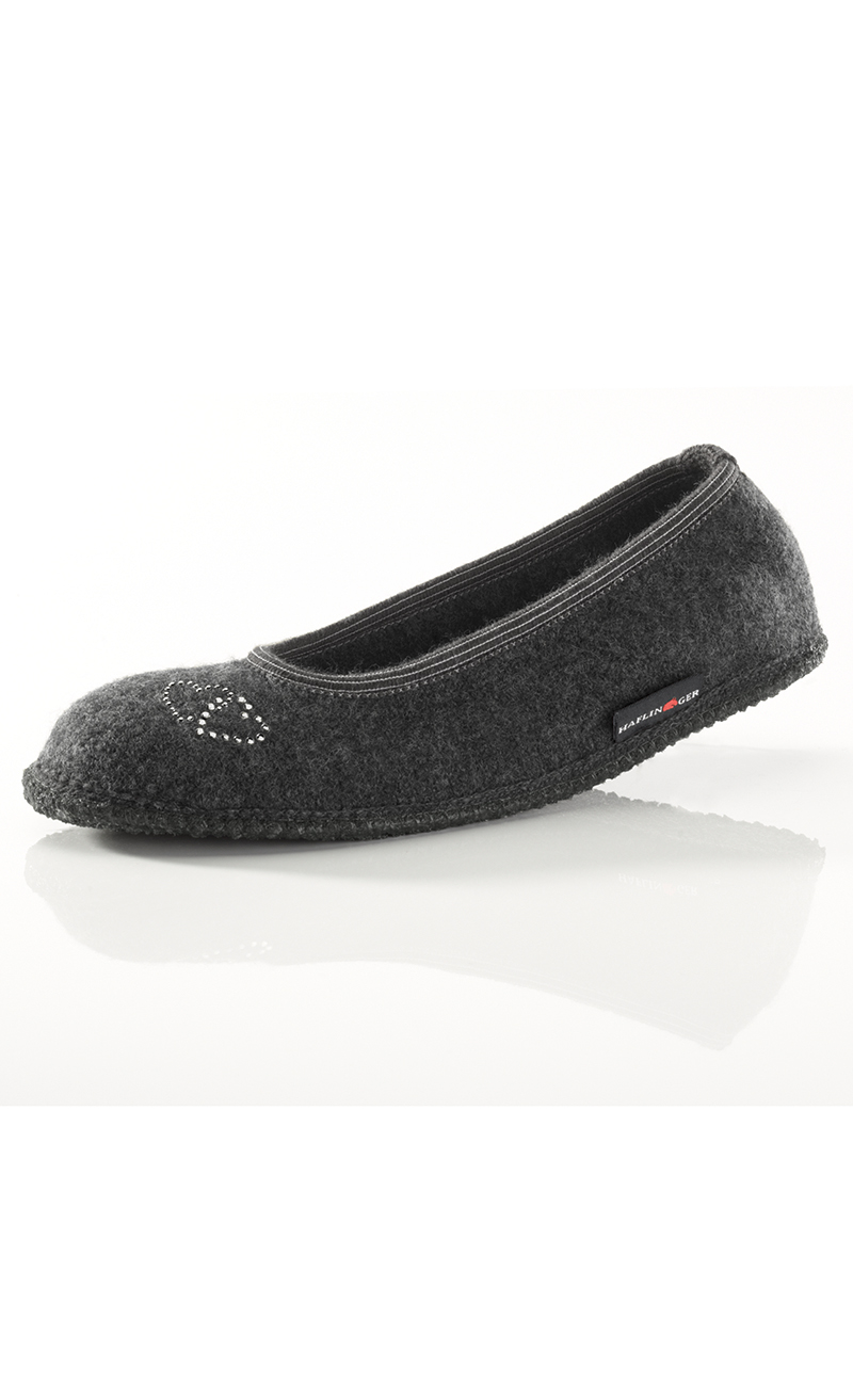 Ballerina. Klimatisierender Wollwalkstoff und leiser, isolierender und mit Latex beschichteter doppelter Filzsohle. Mit Strass-Stein-Besatz.