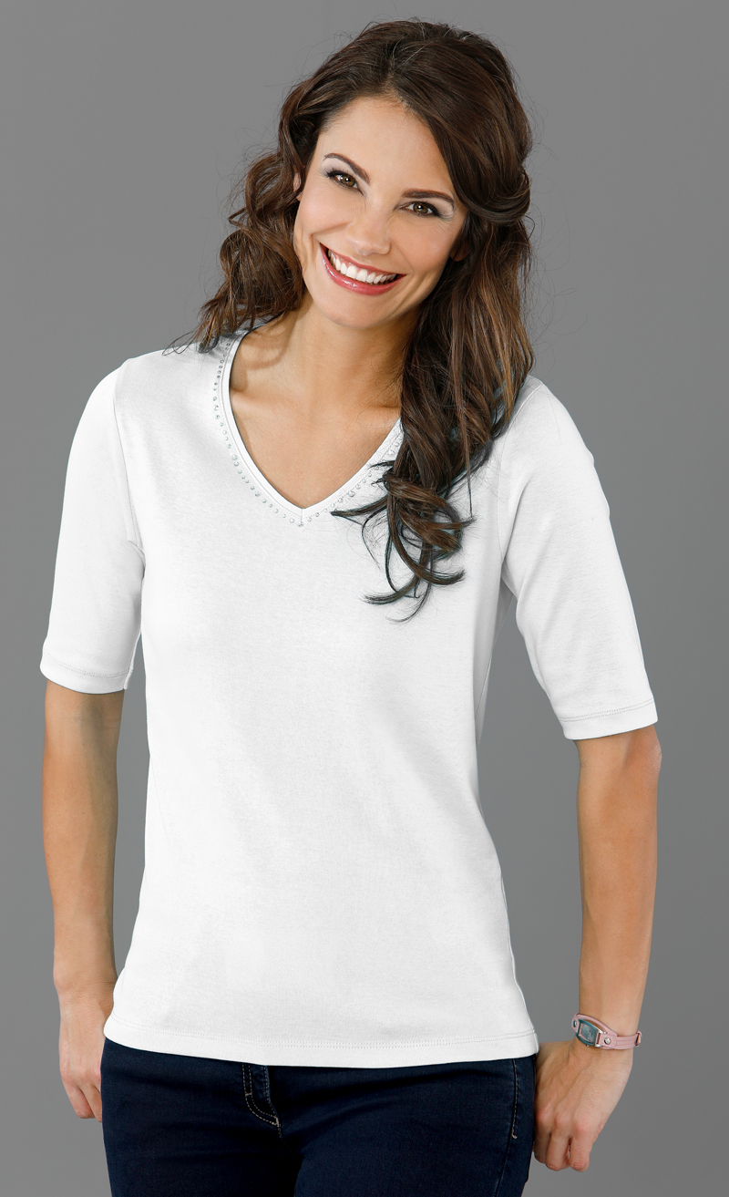 Strassverzierter V-Ausschnitt. Aus biologischer Baumwolle.