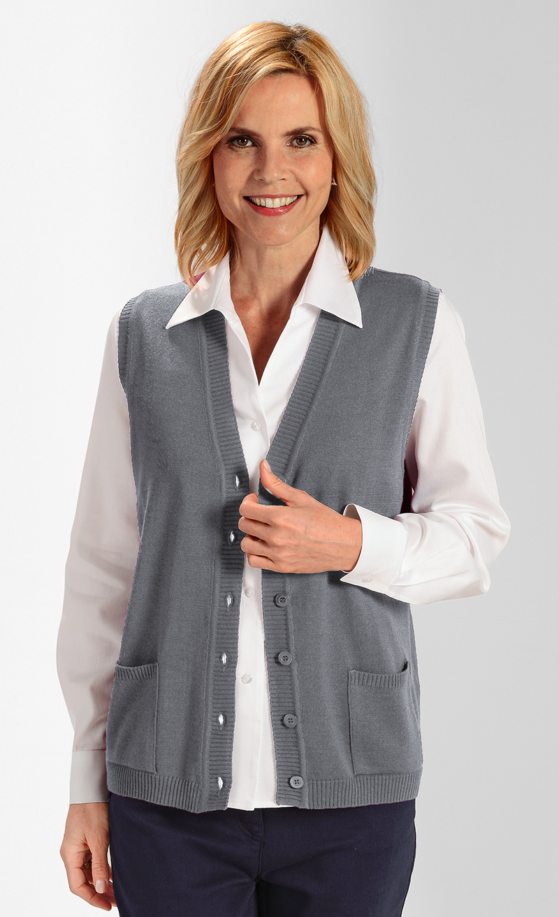 Strickgilet in edler Verarbeitung, gerippter Abschluss am Saum. Zwei Taschen.