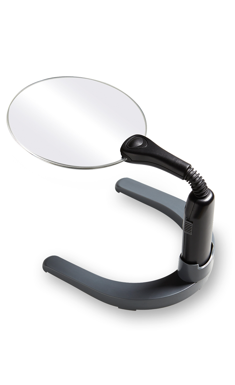 Für bequemes Lesen und Arbeiten durch freie Hände. Mit flexiblem Arm für beste Einstellung. Ø-Linse ca. 13 cm. Acryllinse, Fuss aus Kunststoff. Vergrösserung 2-fach.