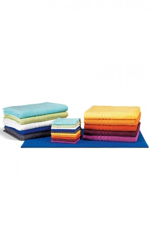 Frottierwäsche und passende Badteppiche aus 100% gezwirnter Baumwolle. Frottierwäsche: 500 g/m2, Badteppiche: 750 g/m2.