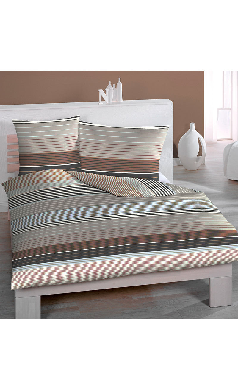 Grafisches Dessin mit einem schönen Glanz. Das Satin-Gewebe ist temperaturausgleichend, angenehm zur Haut und hat eine gute Feuchtigkeitsaufnahme. Mit Reissverschluss.