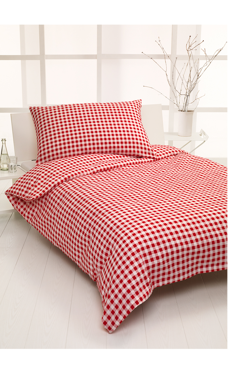 Bettwäsche Garnitur in traditionellem Landhausstil. Das Dessin wirkt durch seine Schlichtheit einladend und gemütlich. Ob blau oder rot - kariert. Die Wahl liegt bei Ihnen. Feuchtigkeitsregulierend und temperaturausgleichend. Aus robuster Seersucker-Qualität, 100% Baumwolle. Bügelfrei.