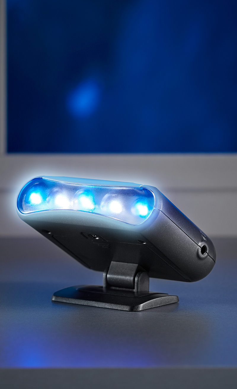 Täuscht Anwesenheit wie durch ein eingeschaltenes TV-Gerät vor. Mit je 3 blauen und 2 weissen LEDs ausgestattet, die sich bei Dämmerung automatisch einschalten und Ihre Wohnung/Haus bewohnt erscheinen lassen. Intelligente Zeitsteuerung. Batteriebetrieben (3 x AA Batterien, nicht im Lieferumfang enthalten).