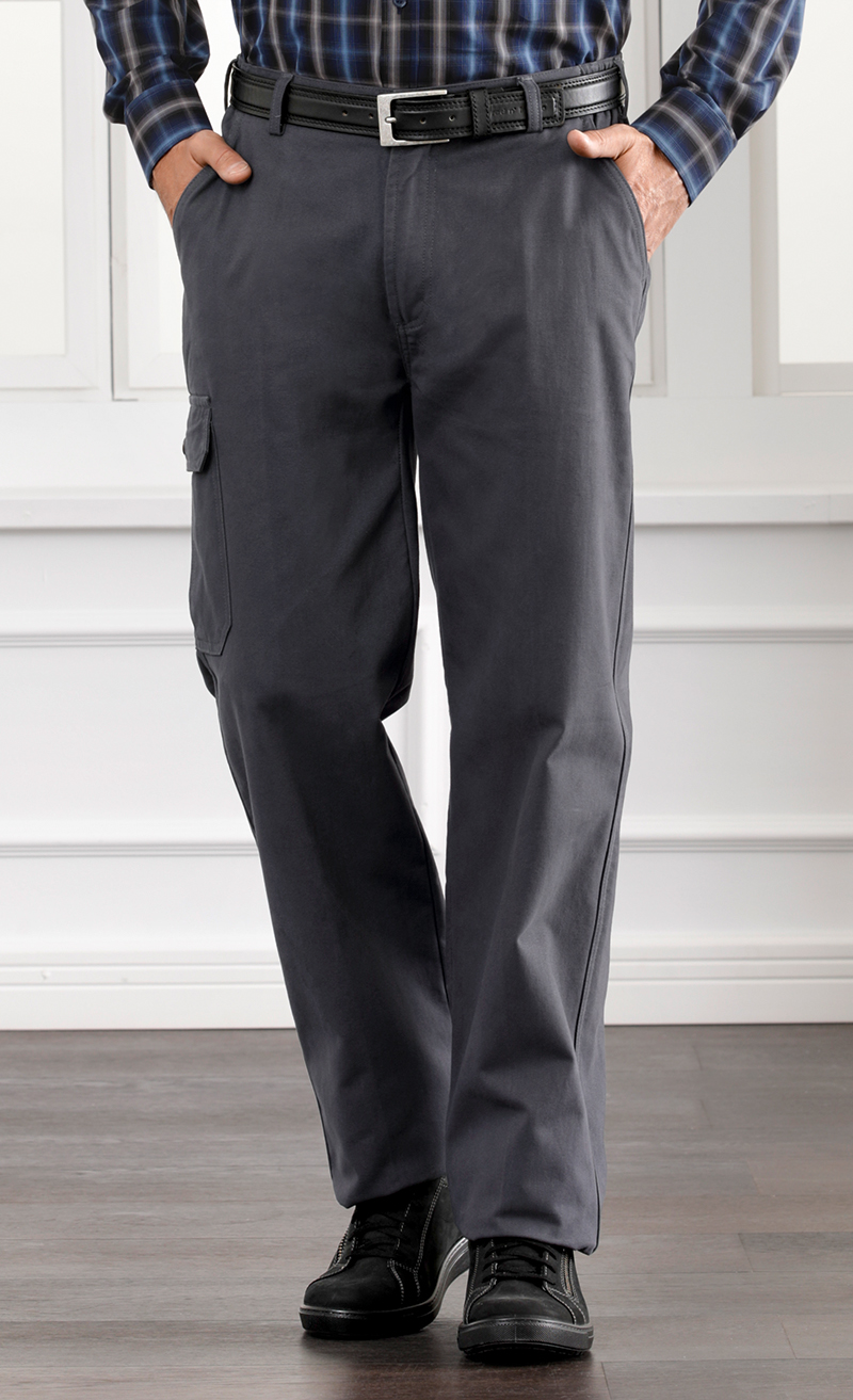 Innen gefüttert und angenehm aufgerauht. Ohne Bundfalten. Bund mit seitlichem Gummizug für bequemen Tragekomfort. Zwei seitlich abgeschrägte Taschen. Zwei Gesässtaschen mit Patten und Knopfverschluss. Aufgesetzte Beintasche rechts mit Patte und Knopf.