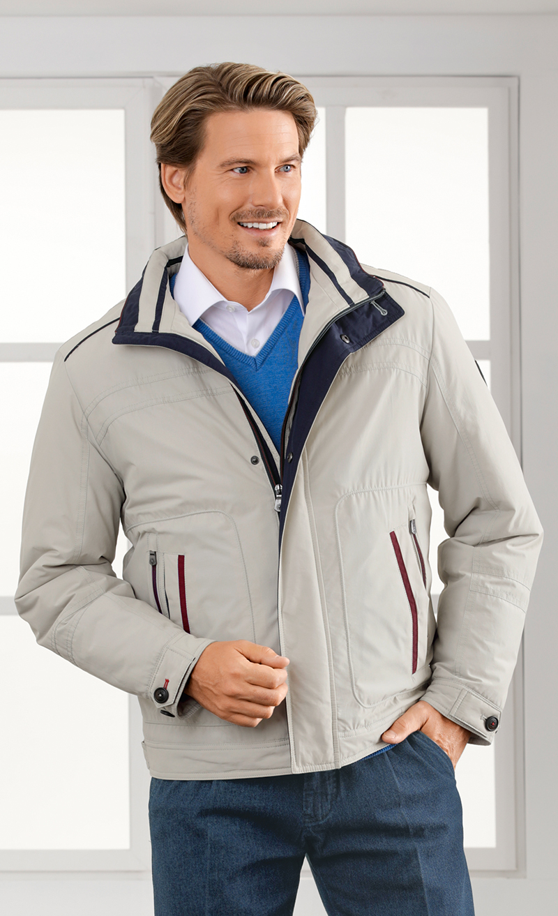 Aufwendige Verarbeitung. Durchgehendem Reissverschluss und Druckknöpfen. Zwei seitliche Taschen mit Knopf, zwei RV-Taschen. Innentasche mit Reissverschluss. Innenfutter mit Steppung. Ärmelabschluss mit Riegel und Knopf.