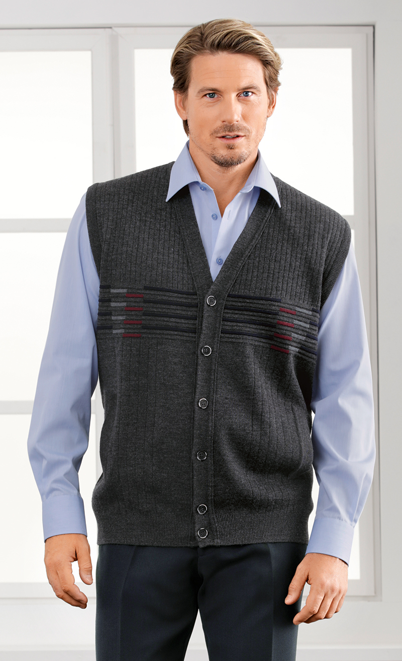 Mit V-Ausschnitt. Aufwendiger Jaquard-Strick. Geknöpft. Mit zwei seitlichen Eingrifftaschen.