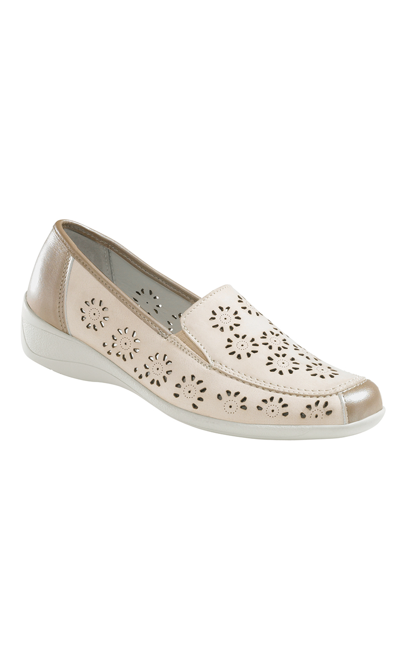 Weiches Leder. Seitliche Elastikeinsätze am Rist. Mit weich gefederter Keilsohle. Dank auswechselbarem Fussbett auch für orthopädische Einlagen bestens geeignet. Rutschhemmende PU Laufsohle. Absatz 3 cm.