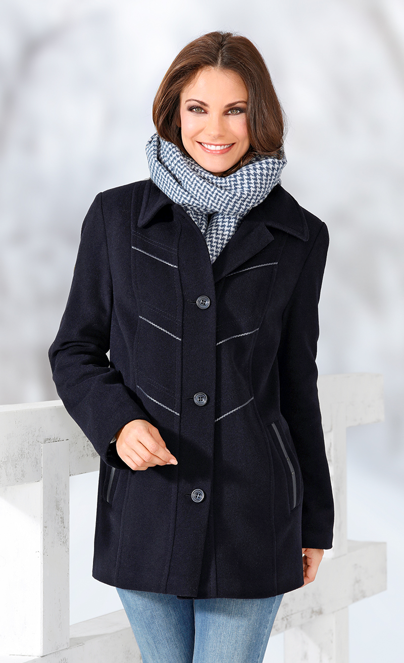 Knopfverschluss. Zwei Aussen- und eine Innentasche. Figurgünstige, leicht ausgestellte Form. Dezente Applikation auf der Vorderseite.