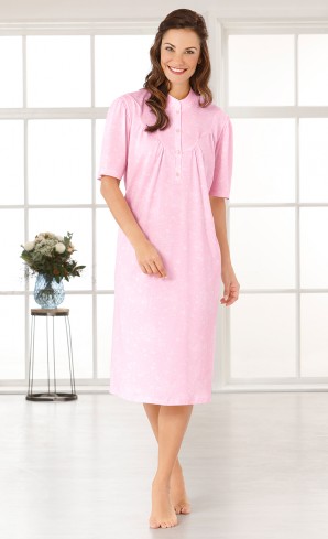 Kleiner Kragen. Lange Knopfleiste. Geraffte Brustpartie. Single Jersey.