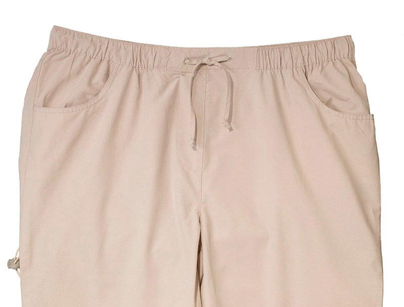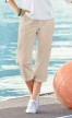 Sehr bequeme Caprihose mit elastischem Schlupfbund, Kordelzug und zwei Taschen. Eine Beintasche und verstellbare Beinweite. Angenehme und pflegeleichte Webware.