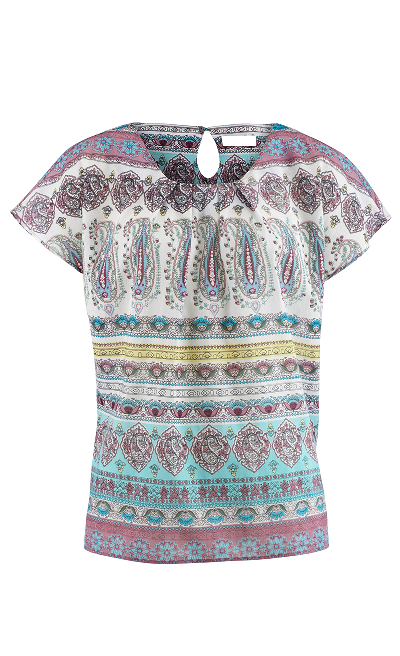 Bequem geschnitten. Überschnittene Schulter. Rundhals mit Falten und Knopfverschluss hinten. 1/4-Arm. GOTS.