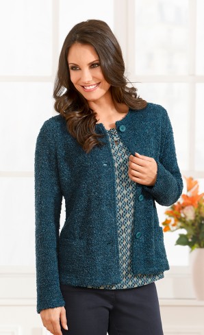 Rundhals mit Knopfverschluss und zwei aufgesetzte Taschen. Meliertes Garn.