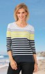 Kontrast Overlock Steppung am Rundhalsausschnitt. Garngefärbter Ringel. Die Elasthanfaser verleiht eine hohe Formbeständigkeit und eine optimale Passform. Single Jersey. Made in Europe.