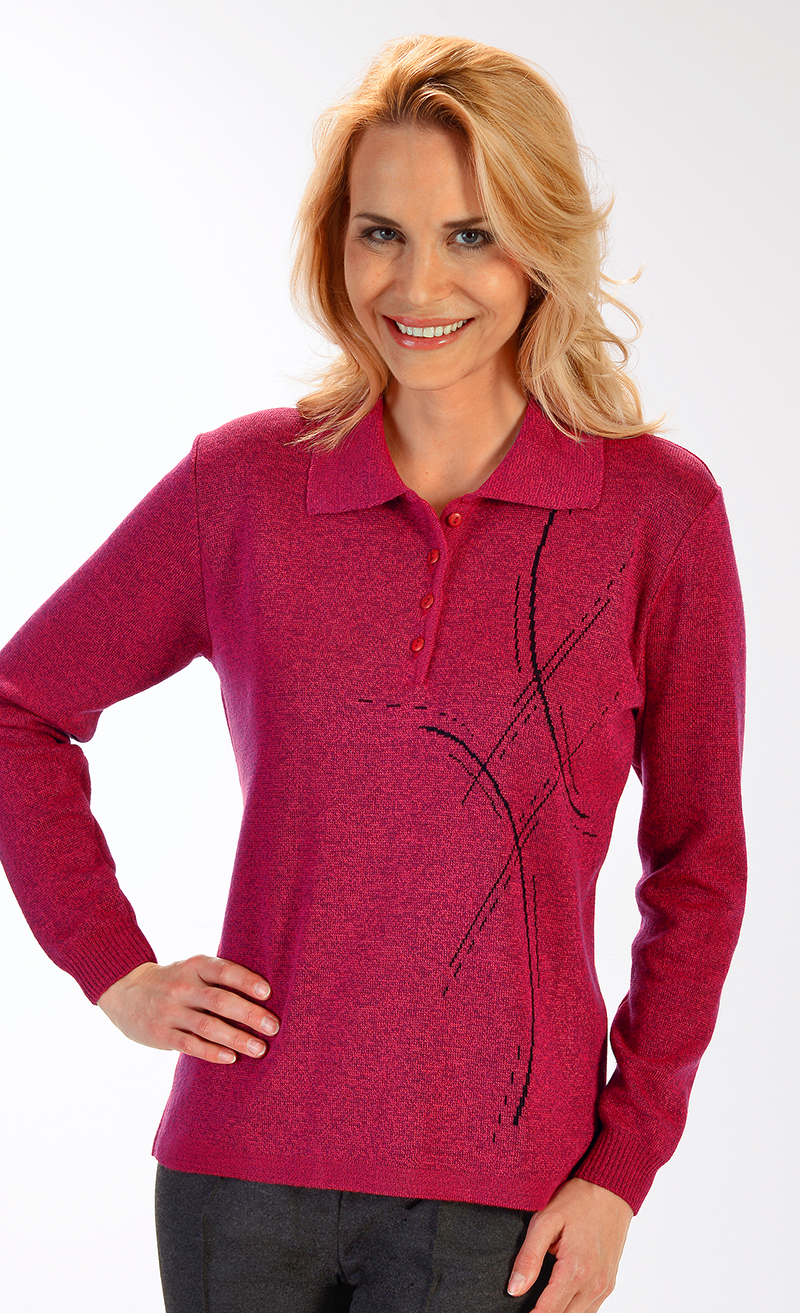 Mit Polokragen in streckendem Kontrastmuster. Gerade Form mit Seitenschlitzen.