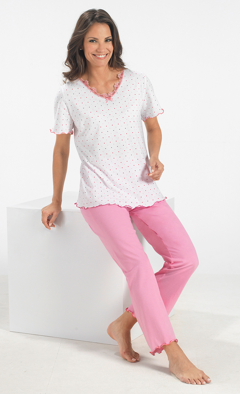 Sehr schöner, aufwendig gearbeiteter Pyjama mit Kräuselabschlüssen und edler Spitzenverzierung am Ausschnitt. Singlejersey.