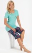 Modischer Pyjama mit verzierten Abschlüssen. Diskrete Applikation auf der Brustpartie. Caprihose mit Seitenschlitzen und Bändel am Bund. Jersey.