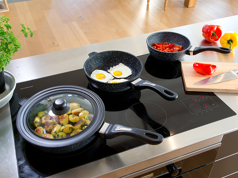 Zur fettfreien Zubereitung von Speisen ohne Anhaften. Stabil, kratzfest und langlebig, mit extra dickem Thermoboden. Titan-Antihaft-Beschichtung. Nicht für Induktionsherd geeignet. Titanium, Granit.