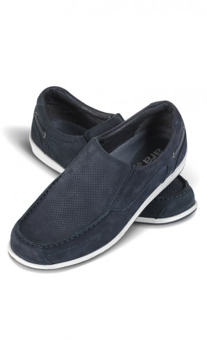 Moderner Herrenschuh, durch elastischen Risteinsatz perfekte Passform und einfaches An- und Ausziehen. Obermaterial Nubukleder mit Lederinnenfutter und weichem Ristpolster für einen guten Halt. Auf der Oberseite feine Perforation für angenehmes Fussklima. Variosohle aus echtem Glattleder. Flache, sehr flexible, rutschsichere Gummilaufsohle.