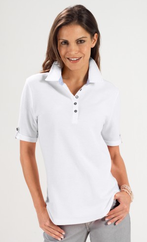 Aufwendig gearbeitetes, feminines Shirt mit doppeltem, farblich mit Stoff abgesetztem Kragen, tiefer Knopfleiste und einer diskreten Ärmelbordüre. Piqué.