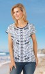Rundhals. Angeschnittener Ärmel. Rückenteil uni. Gerader Schnitt hinten etwas länger.