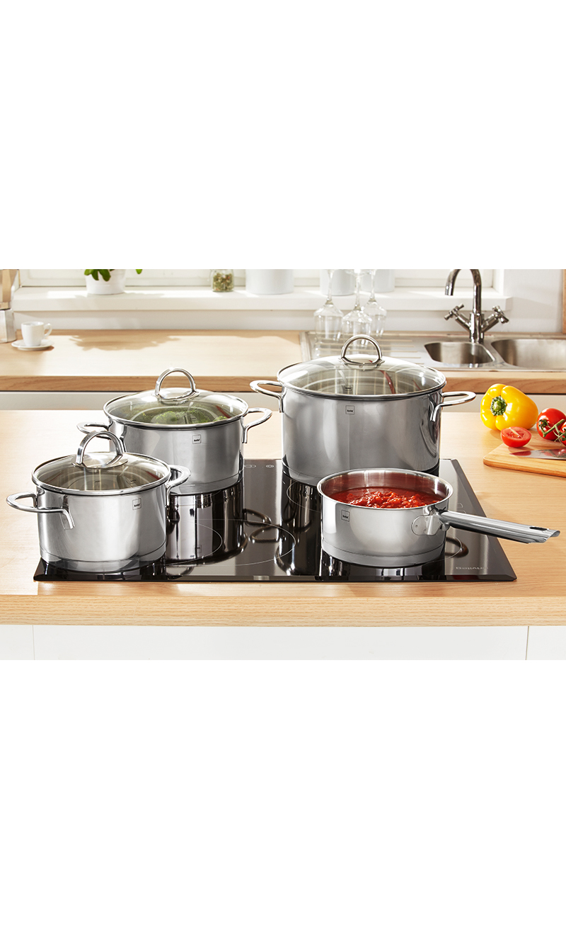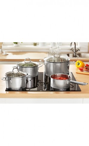 Lot de casseroles. Cocotte Ø 20 cm, marmite à viande Ø 16 et 24 cm, casserole à manche Ø 16 cm. Fabriqué en acier inoxydable de haute qualité, 18/10. Avec un fond capsulé de 5 mm approprié pour tous les types de plaques de cuisson. Chaque casserole est livrée avec un couvercle en verre approprié.