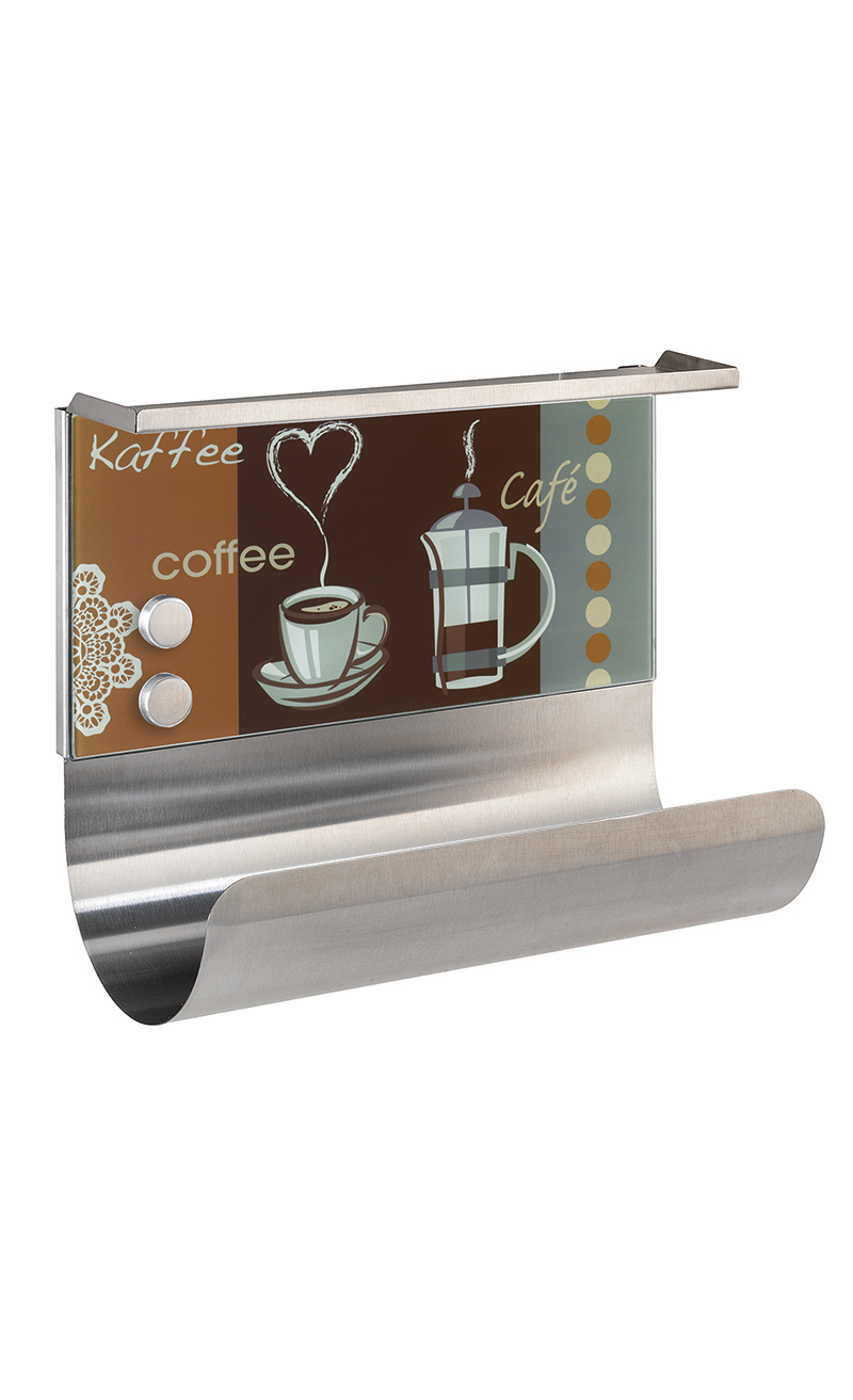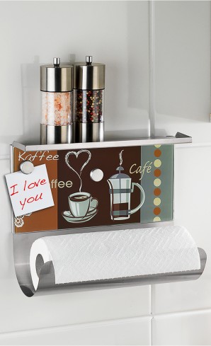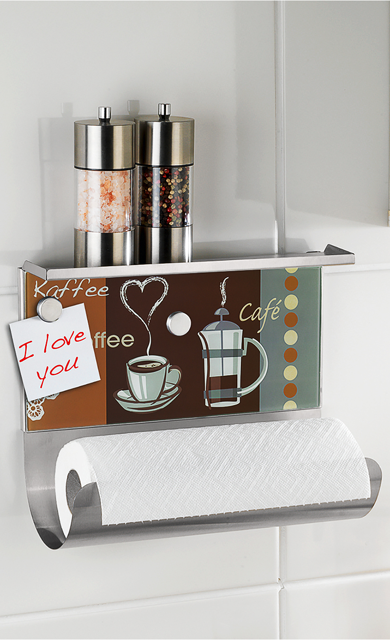 Porte-rouleaux fabriqué en acier inoxydable de haute qualité avec un motif imprimé. Le dessin en verre décoratif est doté d'une surface magnétique et il sert de panneau d'affichage pour des recettes, des notes et bien plus. Convient pour tous les rouleaux courants. Avec tablette pour les épices. Le contenu de la livraison comprend également 2 aimants et un dispositif de fixation.