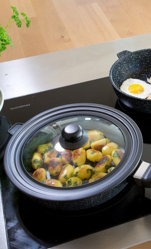 Centre en verre résistant à la chaleur avec évacuation de la vapeur. Facile à nettoyer grâce à son revêtement anti-adhésif spécial. En acier avec plastique.