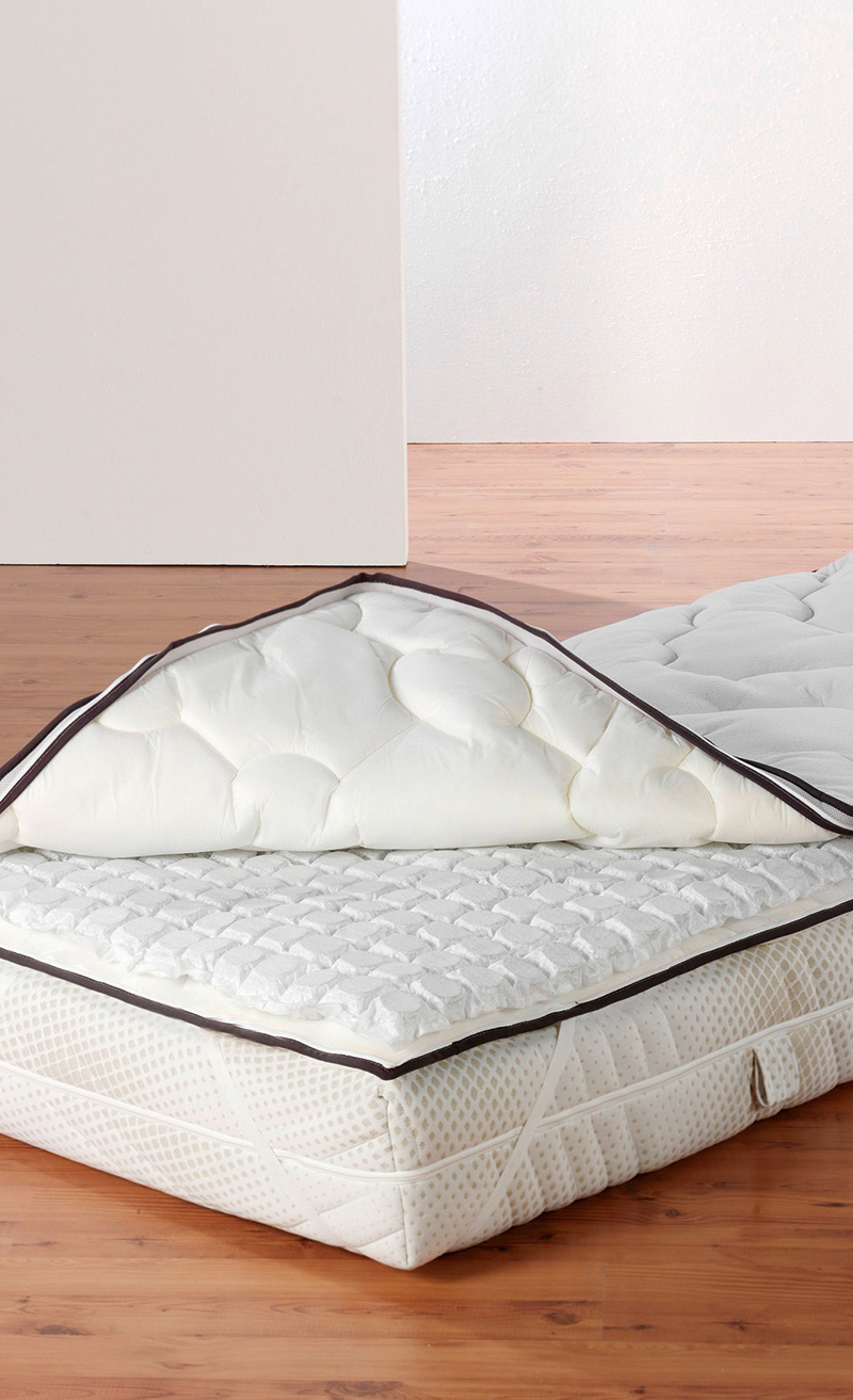 Surmatelas à ressorts ensachés et piquage moelleux en mousse de polyester. Circulation de l'air et évacuation de l'humidité optimales. Avec fermeture éclair. Hauteur: 7,5 cm, matelas à ressorts ensachés 4 cm.