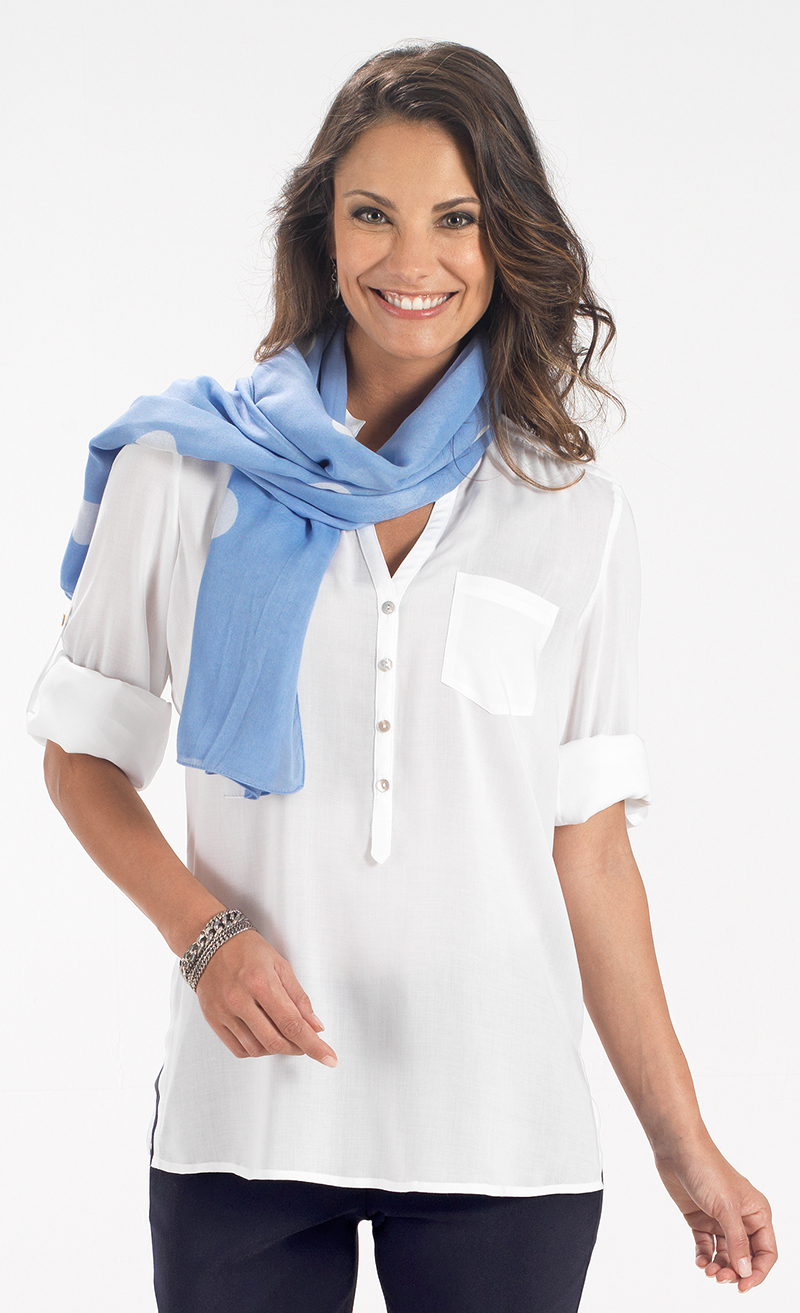 Tunique intemporelle grâce à son décolleté en V et sa forme délicatement évasée. Avec fentes latérales et manches à retrousser. Empiècement au dos avec petits plis couchés pour une totale liberté de mouvement.
