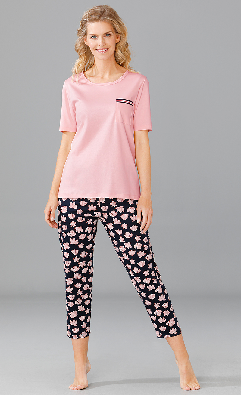 Encolure en U. Manches courtes. Une poche de poitrine. Pantalon 7/8 imprimé. Interlock