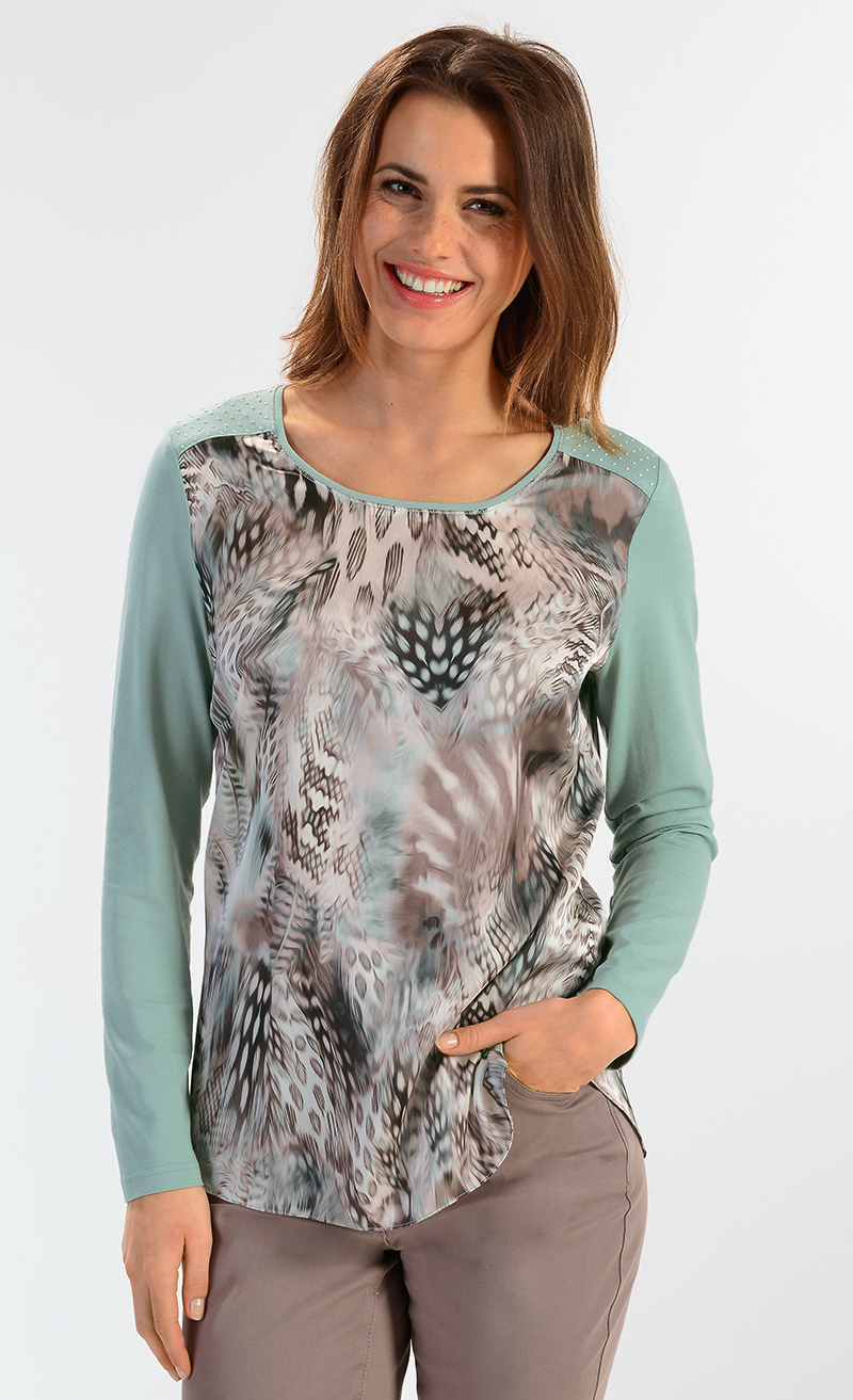 T-shirt modernisé par un empiècement de blouse avec imprimé devant et au dos. Ourlet arrondi.
