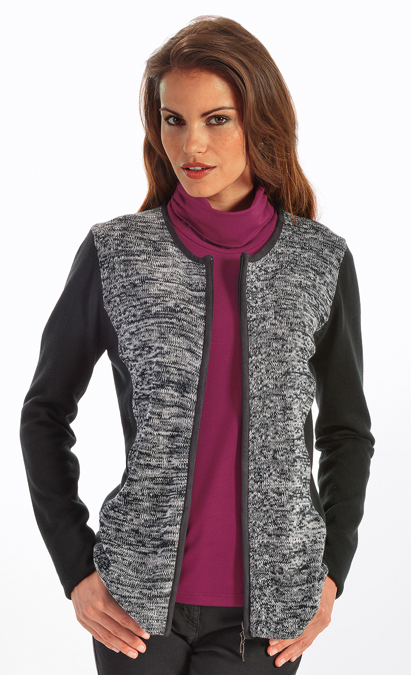 Cardigan stylé d'une glissière à double sens et d'empiècements noirs unis sur les côtés.