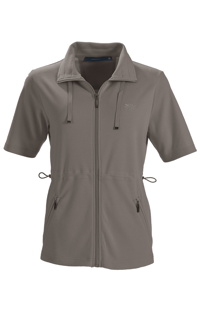 Veste de loisirs à manches courtes avec glissière. Ultime clin d'œil mode: deux poches latérales coupées avec glissière. Ampleur de la taille et du col réglable grâce à une coulisse. Qualité interlock.