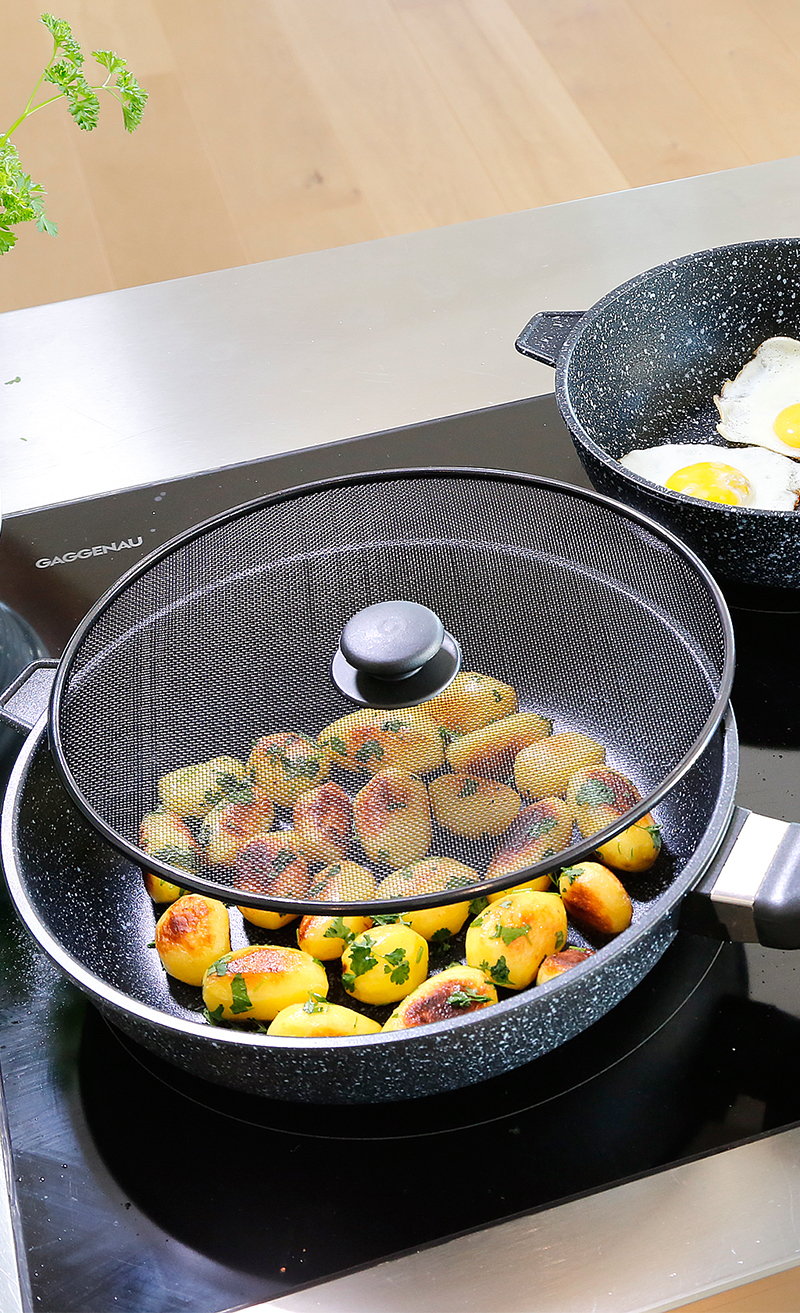 Finies les projections de graisse pendant la cuisson grâce à ce couvercle en grille métallique avec poignée en plastique. Il est même possible de rajouter du liquide! 29 cm de Ø environ.